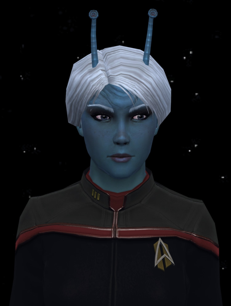 | Service Record | Position: Executive Officer, U.S.S. Neptune NCC-74767 Rank: Commander Diplomatic Experience: Moderate Citations: • Starfleet Science Prize 2398 • Starfleet Command Commendation 2406 • Purple Star (wounded in combat) 2409 • Daystrom Award 2413 2393-2399: Six-year officer program, Starfleet Academy. Double major in Probability Logistics and Particle Physics, minor in Basic Medical Services. 2399: Commissioned as Lieutenant Junior Grade, Assigned to U.S.S. Antietam - NCC-67433 (Akira-class), as a Sensor Analysis Officer. 2402: Promoted to Lieutenant, reassigned to U.S.S. Ranger - NCC-70915 (Nebula-class) as Junior Science Officer. 2406: Reassigned to U.S.S. Rutherford - NCC-90276 (Miranda-class) as Head of Archaeology. 2408: Reassigned to U.S.S. Renown NCC-96047 (Regent-class) as Senior Science Officer. 2409: Promoted to Lieutenant Commander, reassigned to U.S.S. Maiden NCC-92887 (Cochrane-class) as Assistant Chief Science Officer. 2412: Promoted to Commander, reassigned to U.S.S. Zhukov NCC-261316-A (Vesta-class) as Chief Science Officer. 2413: Assigned to New Romulus, Classified Assignment. 2414: Reassigned to U.S.S. Europa NCC-80104 (Luna-class) as Executive Officer. 2415: Reassigned to U.S.S. Neptune NCC-74767 (Intrepid-class) as Executive Officer. |